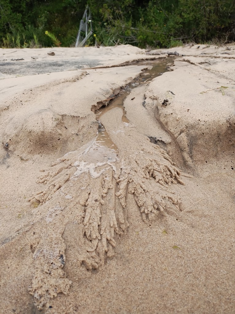 The image shows how even a small flow of water, strengthened by recent rains, can push sand in a distinctive pattern. With enough water, the delta would grow and the stream would cross the beach and make it to the lake.