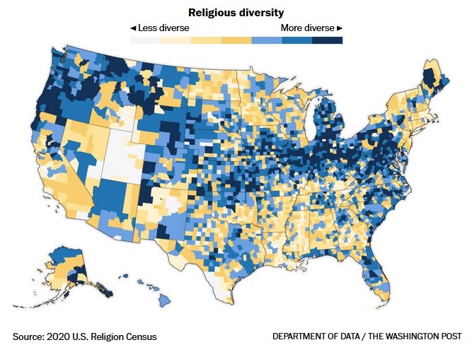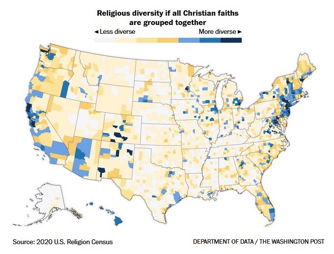 But if we regard Christianity as a single monolith — lumping all the Catholics, Presbyterians, Methodists, Lutherans and whatnot in one big sacramental wine jug — we find that the most religiously diverse places in America are generally the big cities. The urban Northeast leads the pack.