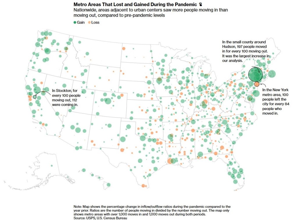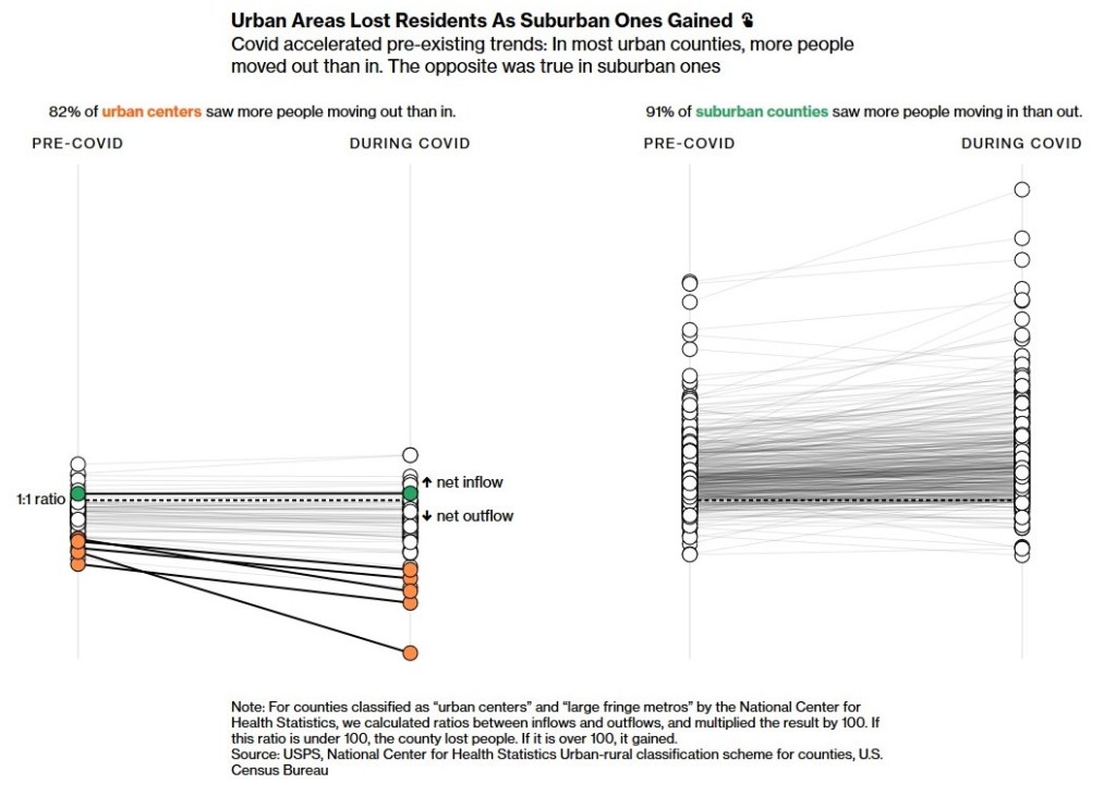 I appreciate the effort at CityLab to take all of the data regarding where Americans moved during the COVID-19 pandemic and put it into graphs and charts. Good graphs and charts should help illustrate relationships between variables and help readers see patterns. Here are several choices that I thought succeeded.