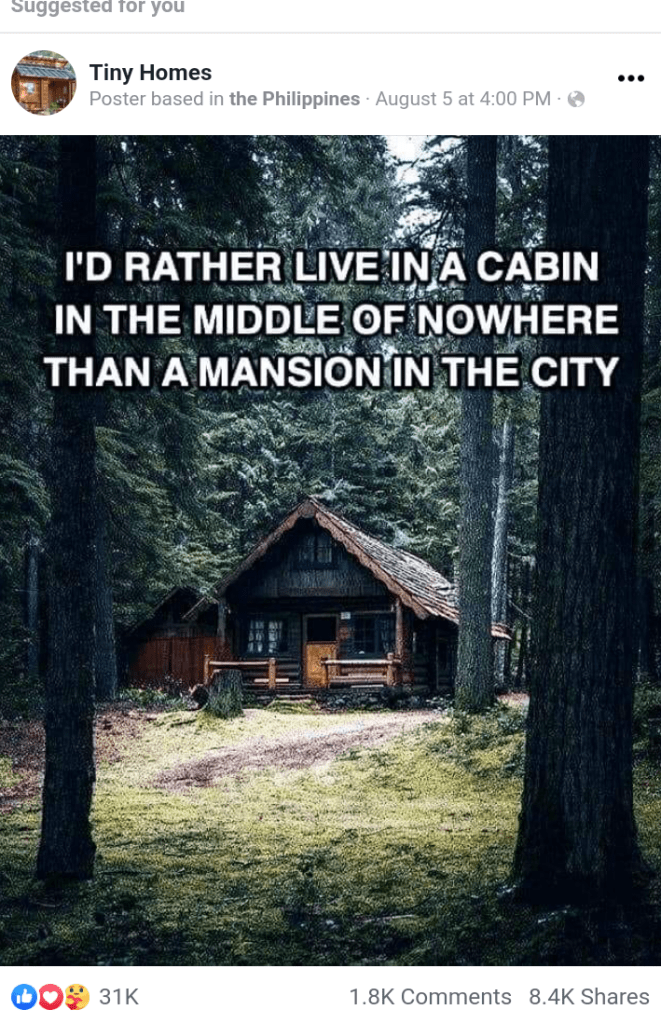 I think this is promoting living in the country as the person making the statement would be okay with a cabin rather than a mansion. The cabin looks like it is in decent shape, but it is no mansion.