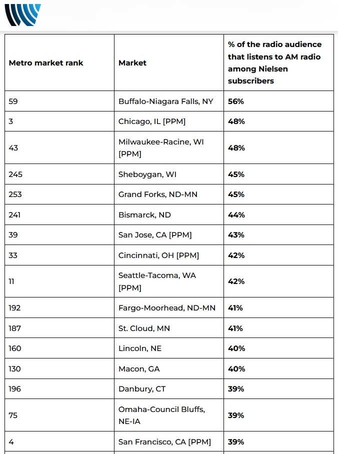 A recent look at “the % of the metro radio audience that listens to AM radio in a month” shows these cities at the top: