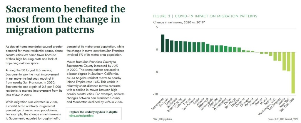 In this comparison of 2020 and 2019 migration data, several big cities fared the worst: San Francisco, New York, Seattle, Los Angeles, and Washington, D.C. Sacramento did well because of spillover effects from the Bay Area.